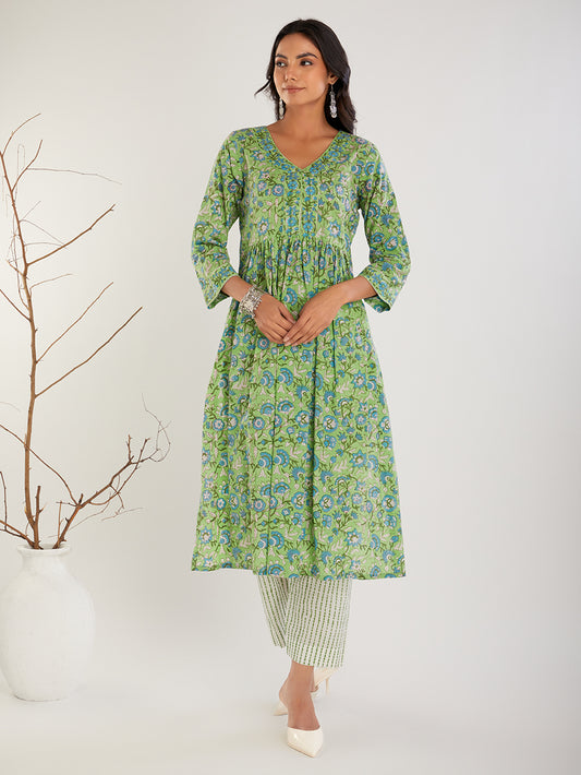 Green Hand Block Print Cotton Pant