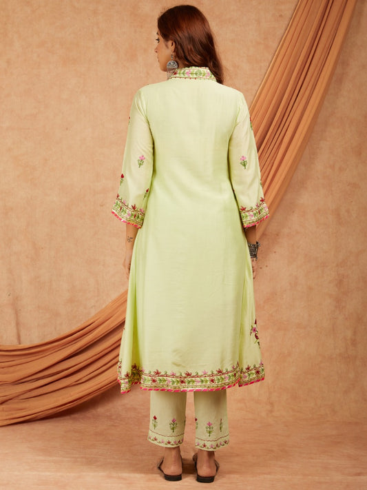 Green Chanderi Aari Embroidery Kurta with pants- set of 2