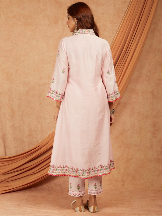Peach Chanderi Aari Embroidery Kurta with pants- set of 2