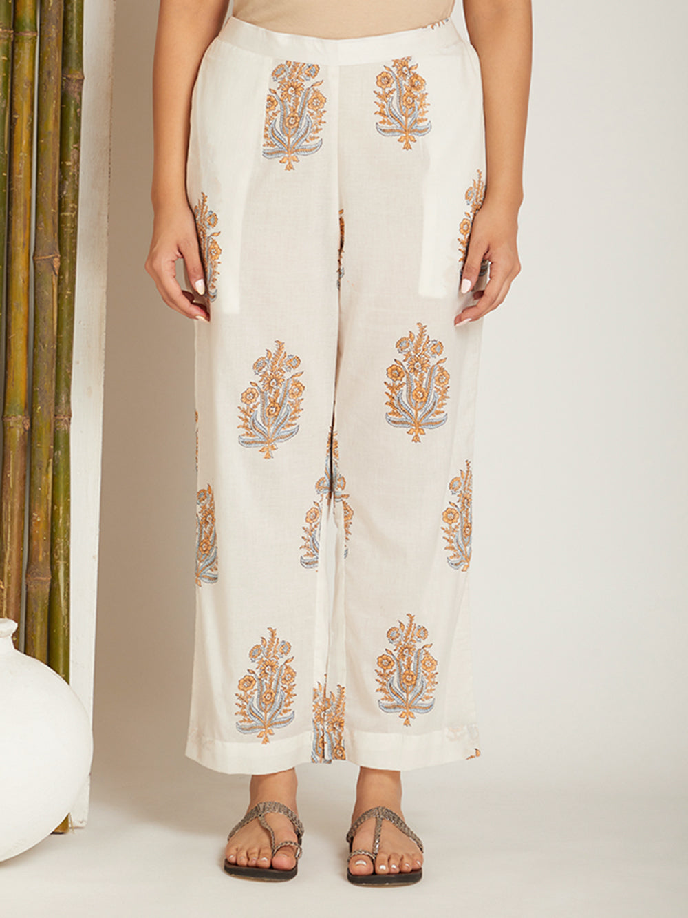 Straight-leg block printed pants with a mid-rise fit, featuring a half-belt and half-elasticated waistband for comfort. Designed with two functional pockets for everyday ease.