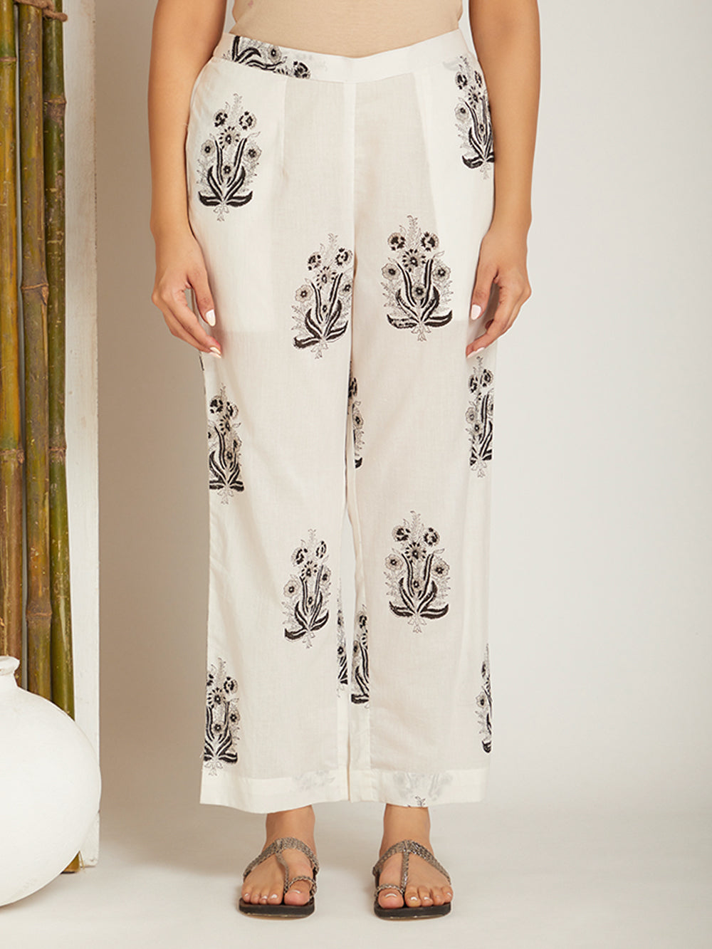 Comfortable block printed straight-fit pants featuring a mid-rise waist with a half-belt, half-elasticated design. Includes two side pockets, ideal for daily wear with a relaxed yet stylish fit.