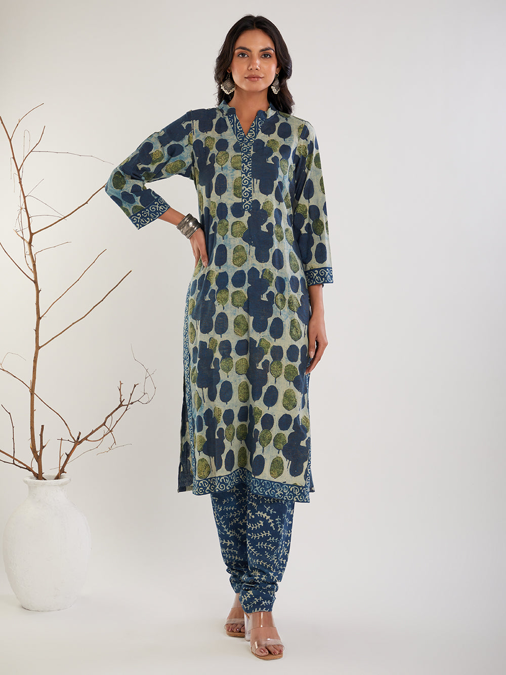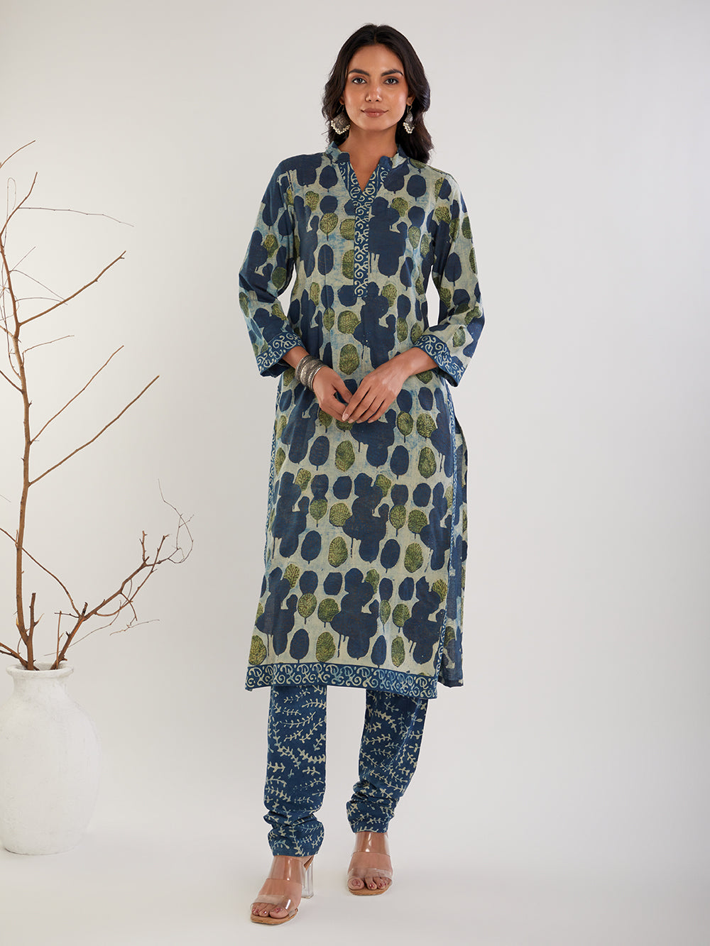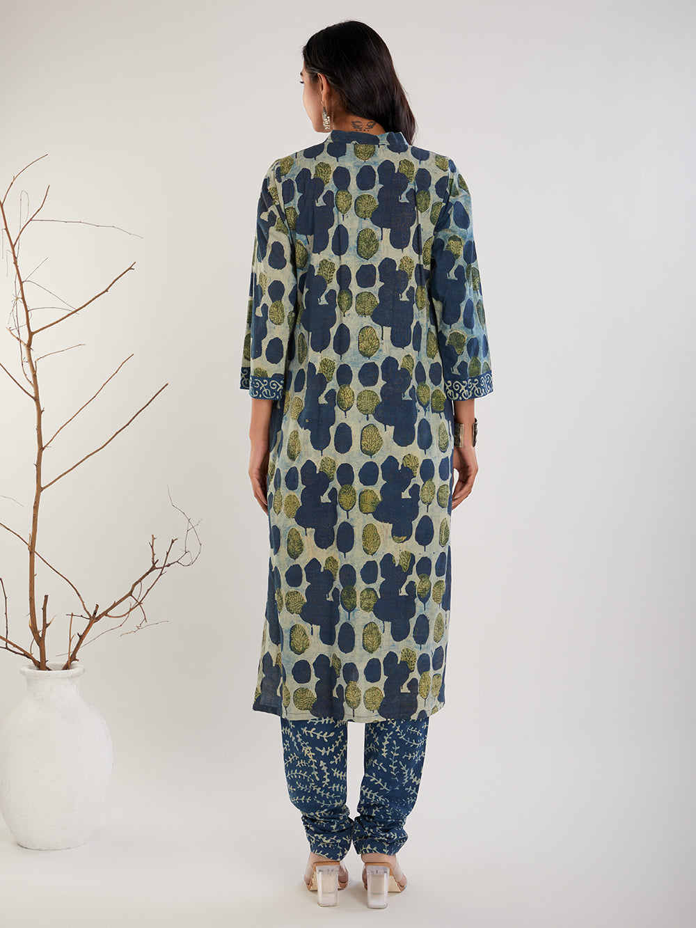 Blue & Green Vanaspati Hand Block Print Cotton Kurta