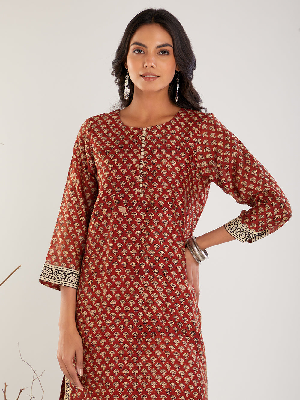The Red & Beige Chanderi Silk Bagru Print Cotton Kurta showcases traditional hand block printing on soft, breathable fabric. Featuring a V-neckline, 3/4 sleeves (17"), a straight silhouette, a basic hemline, and a functional pocket, this kurta blends timeless elegance with everyday comfort.